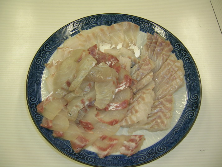 @スズキの塩焼き Aスズキと黒鯛の刺身 Bスズキと黒鯛の煮付け C黒鯛の皮の湯引き