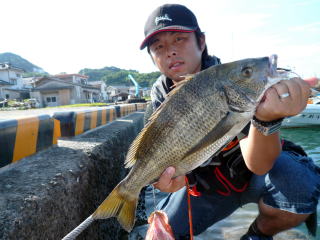 息子も初挑戦で真鯛、56cm、チヌ35cmを上げま