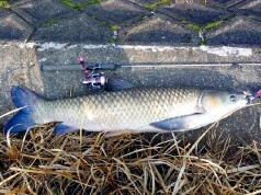 セイゴ狙いでルアー投げてたら、草魚の110cmが釣れました〜。