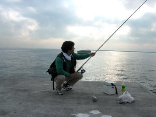 13時頃、モエビを餌に内側で黒鯛がヒット! しかし痛恨の針外れ。(^^;