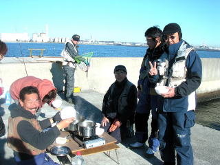9:00に竹内さん、神崎さんが用意してくれた、おでん&豚汁をみんなで