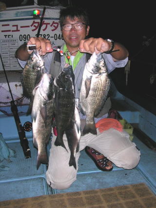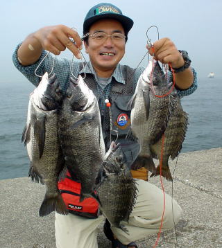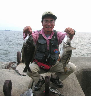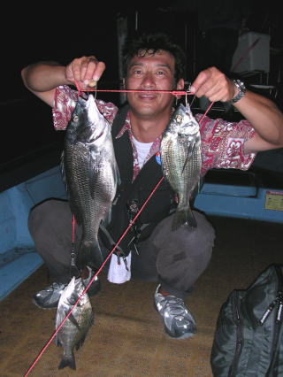 に船を留めて掛かり釣りをやってる人が小さめの黒鯛、キビレを連続Get。