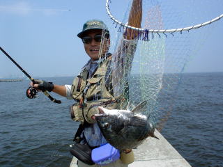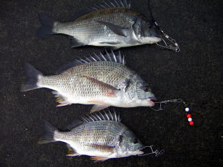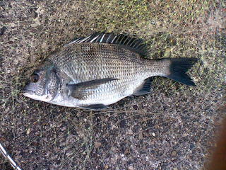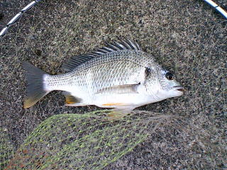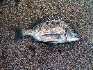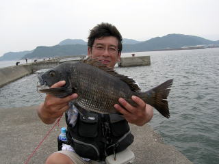 雨がやや弱まったところで、堤防に行ってみると40cmの黒鯛だった。