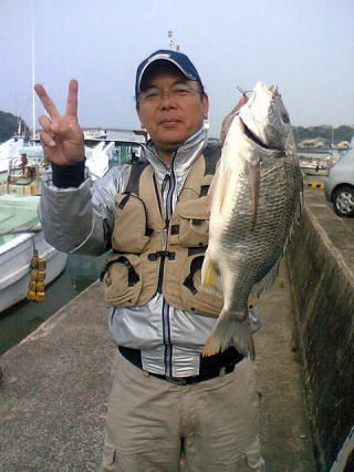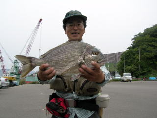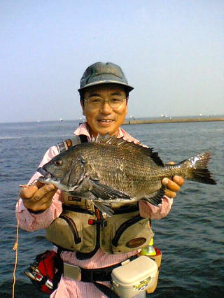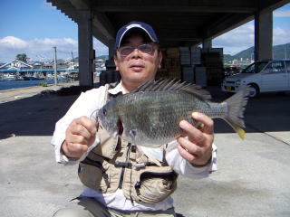 嬉しそうな笑顔で、遂に九州で初のチヌをGetした。