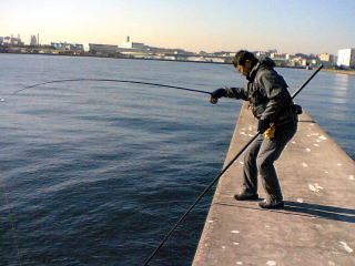 しかし、一投目で根掛かり、仕掛けを作り直し、丁寧にパイプ餌をとりつけ、ポ