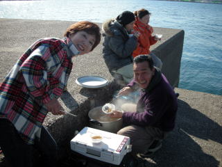 渡船の竹内御夫妻が用意してくれた豚汁を頂いた。