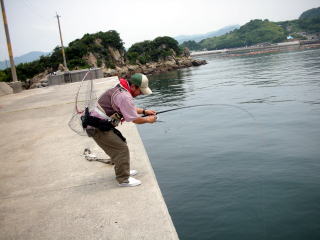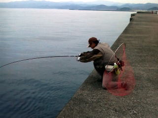 10分ほど探ったが、外側の潮は早く、思った様に落とし込めない、すると神崎