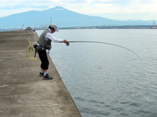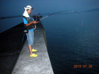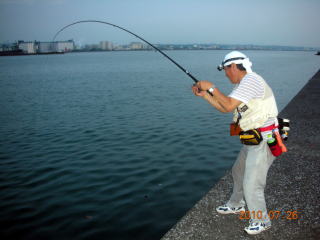テトラ方面に暫く落とし込みながら進むと糸が走ったと同時に竿先にガクン、そ