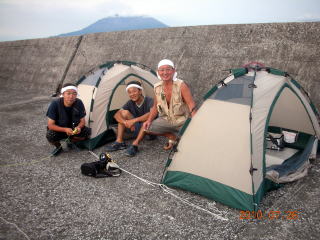 13時前の船で堤防に上がり、テントを組み立て仕掛けの準備。