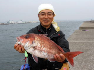 基地近辺で落とし込むと着底後、モゾッときて42cmをGetした。