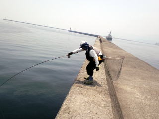 15:30の船で渡ると、この付近は堤防の高さが低くてヘチ釣りはやり易い。