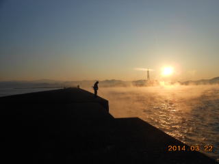 朝の気温は0℃、河口から霧が押し寄せて幻想的な雰囲気の中で釣行を開始
