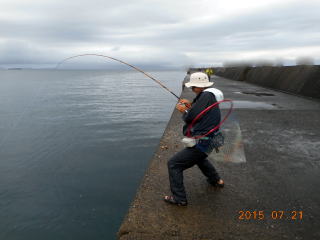 釣ったの?と聞くと、モンスターコロを掛けたがテトラ方面に走られて200m巻