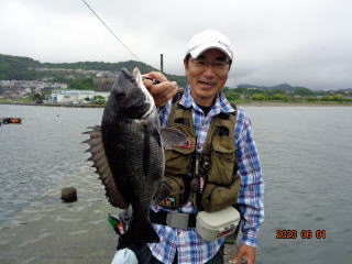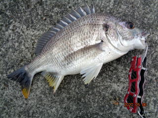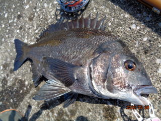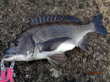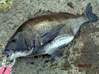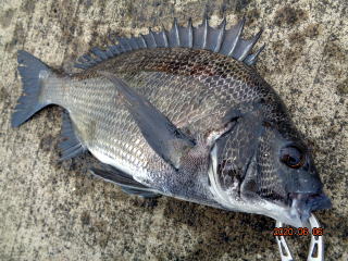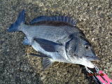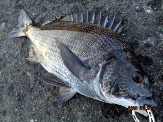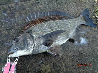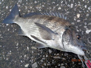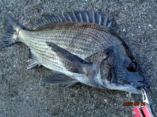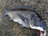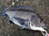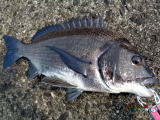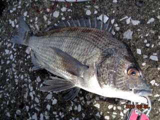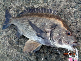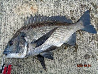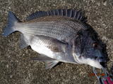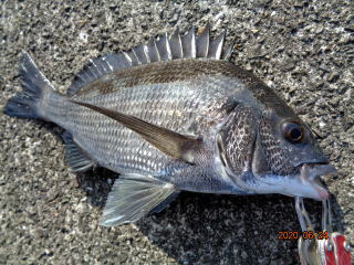 幸先の良いアタリで取り込んだのは、35cmの黒鯛